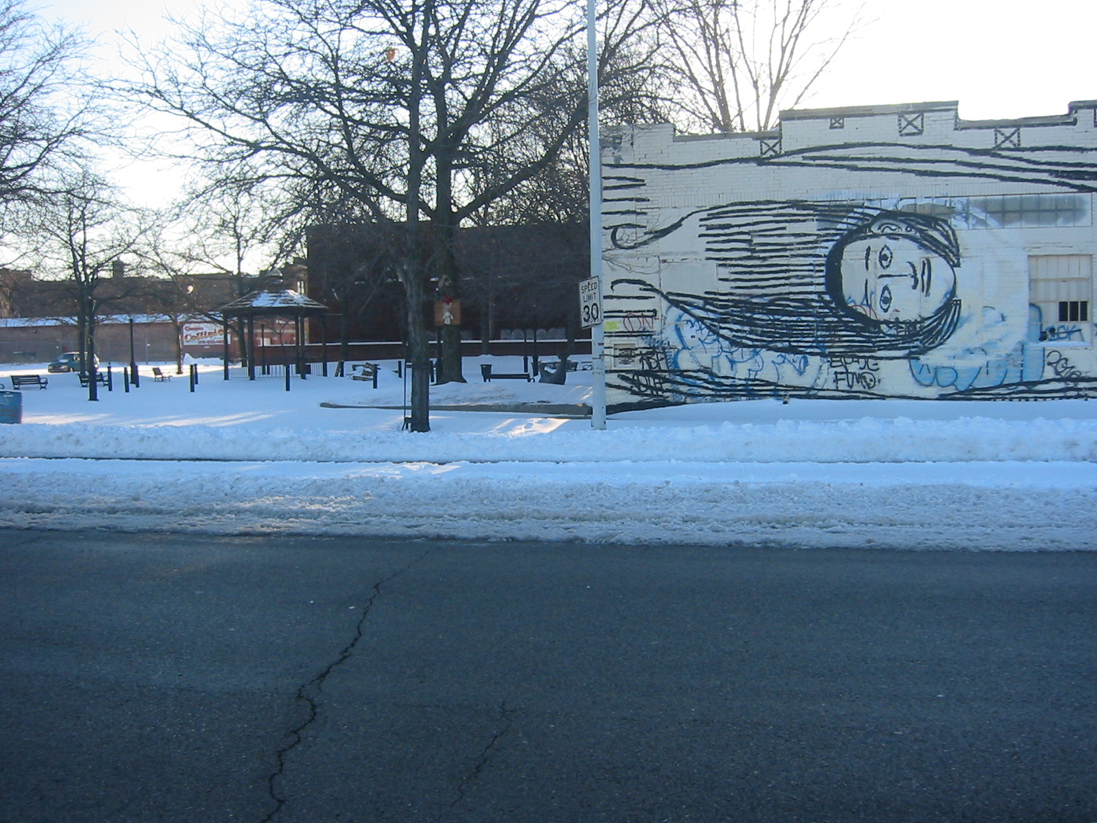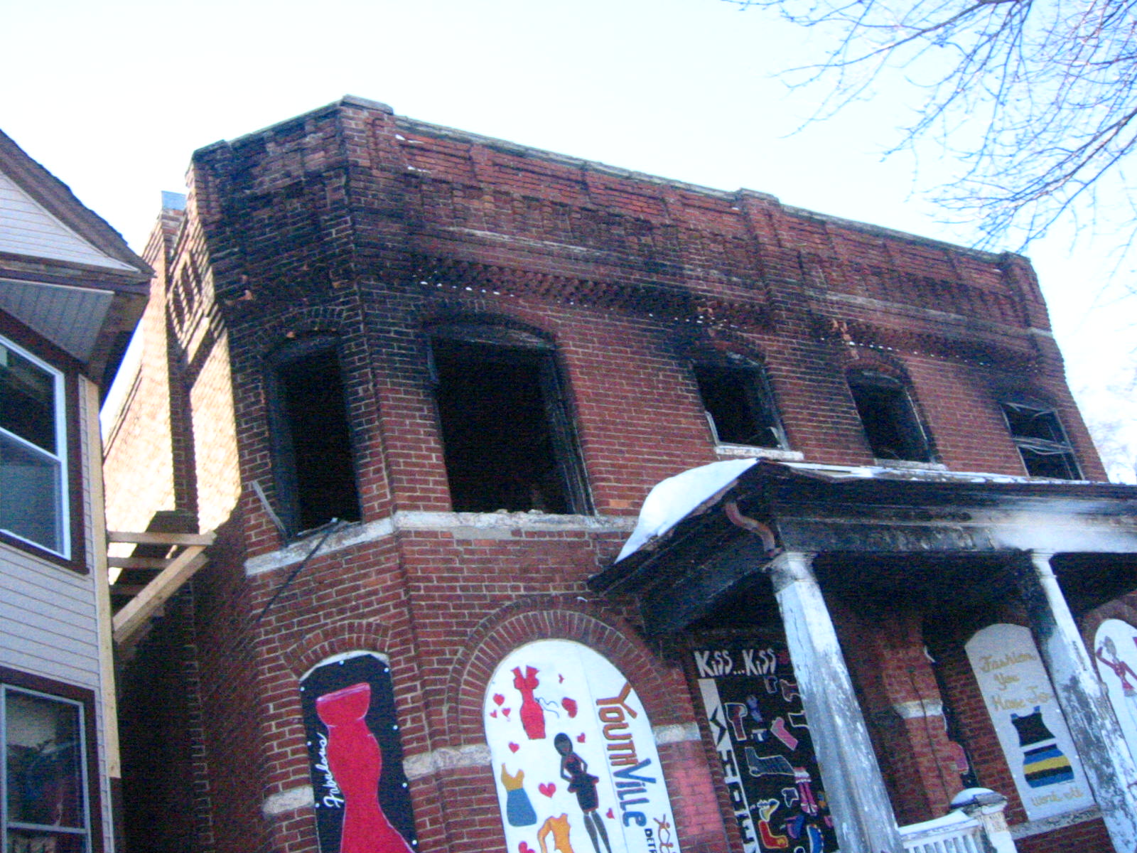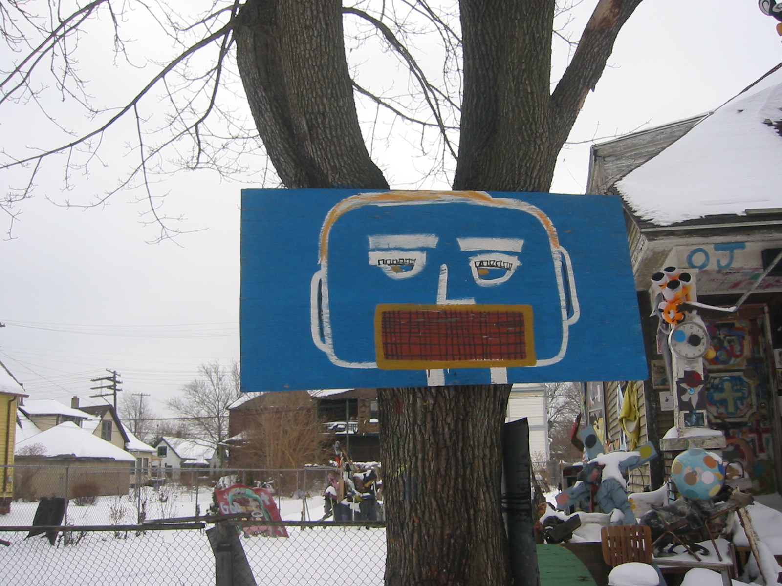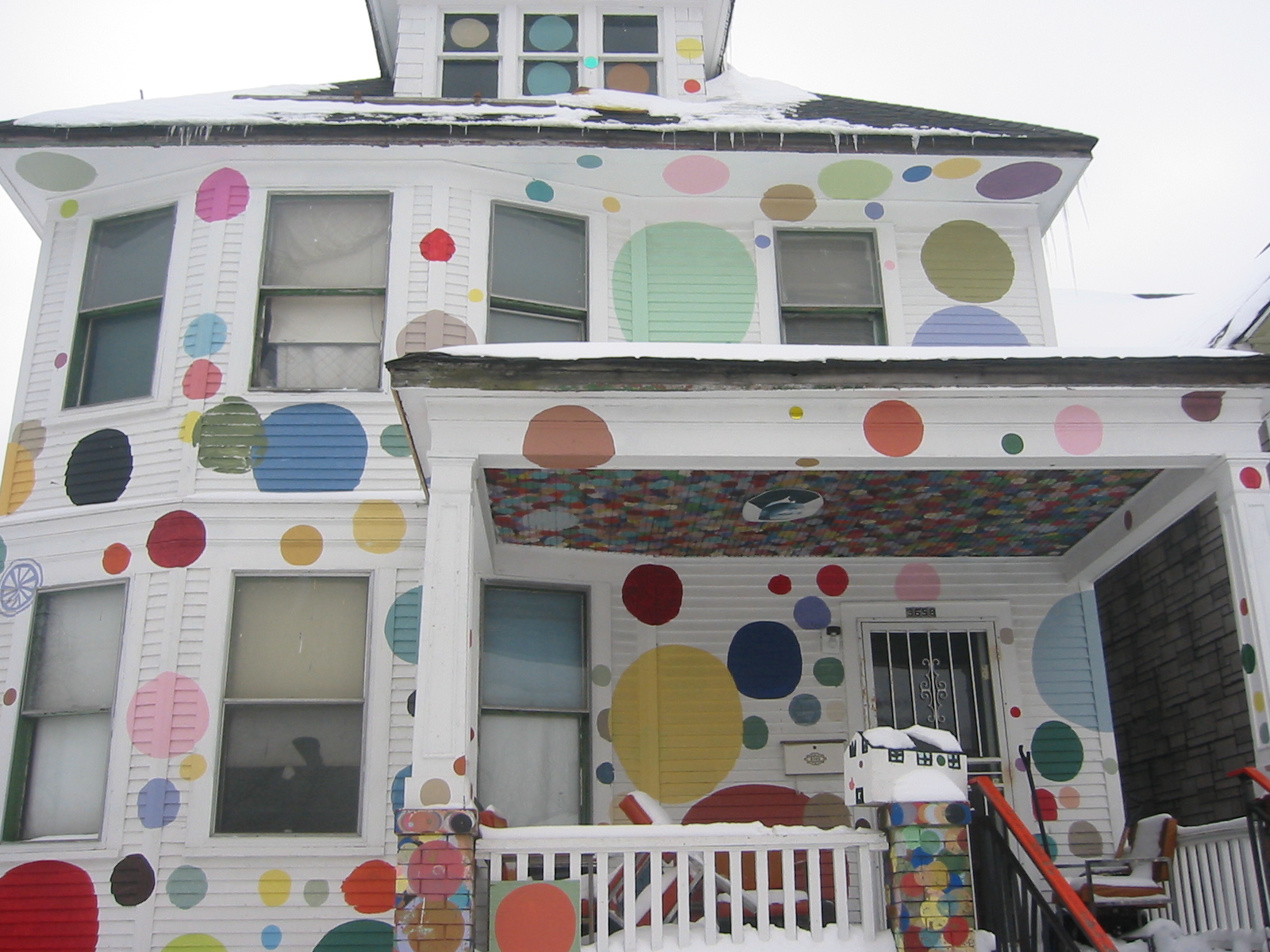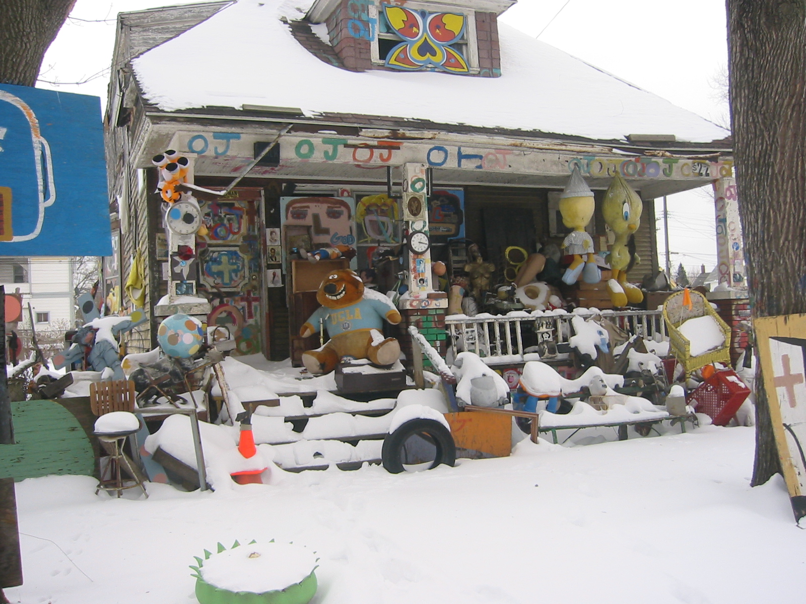 Yesterday I cleaned out a hallway that was filled with all kinds of junk, sorted it, and cleaned the space. The next step is to paint. I also found out about a volunteer day at an urban farm called Earth Works. They farm about 10 acres all over vacant lots. I pruned apple trees and pear trees. We also started some bed prep. The guy who runs Earth Works called me up later for some extra help. After a free lunch from the farm I headed towards a location one of the Trumbull folks told me to check out but not what would be there. It is this massive art project that has taken over a vacant block! I came back to the Trumbull and split fire wood all afternoon. Tomorrow night I’m going to help out at a bike co-op called the Hub.
