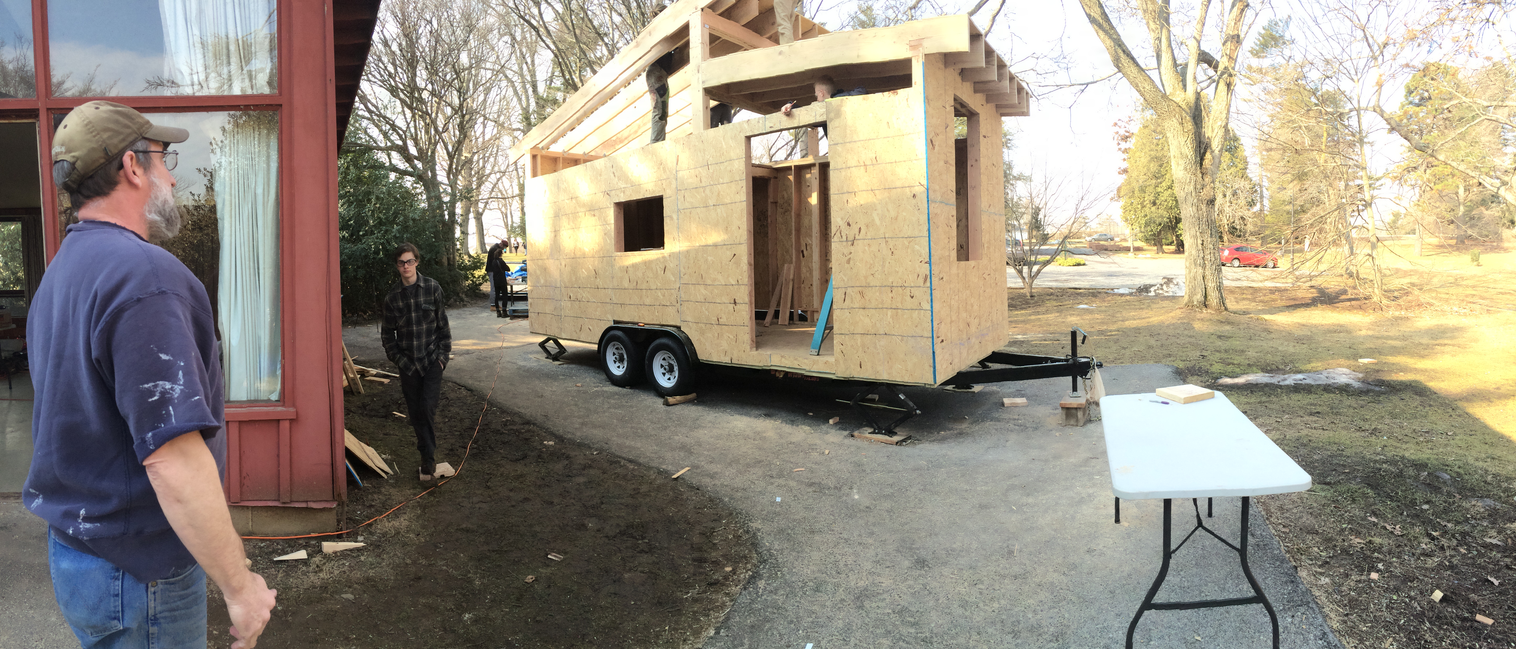 Today marked the ninth day of the Tiny House Project.  It’s hard to believe that we started with a trailer just over a week ago and now we have all the walls and the roof up! With just two days to go, we are ready to work extra hard to get as close as we can to our goal. We would like to finish the whole exterior of the house including installing the windows and the door.  While some of us worked on the structure of the house, others worked on the interior; this is a work pattern we have been using since day one. One of the coolest things we have worked on for the inside of the house has been a countertop made out of live-edge wood. We started off by cutting the wood in half and running both halves through the planer. We then put the two pieces next to each other and worked on making them level. Now, the two pieces are joined, sanded and coated and we have our finished countertop for the house.