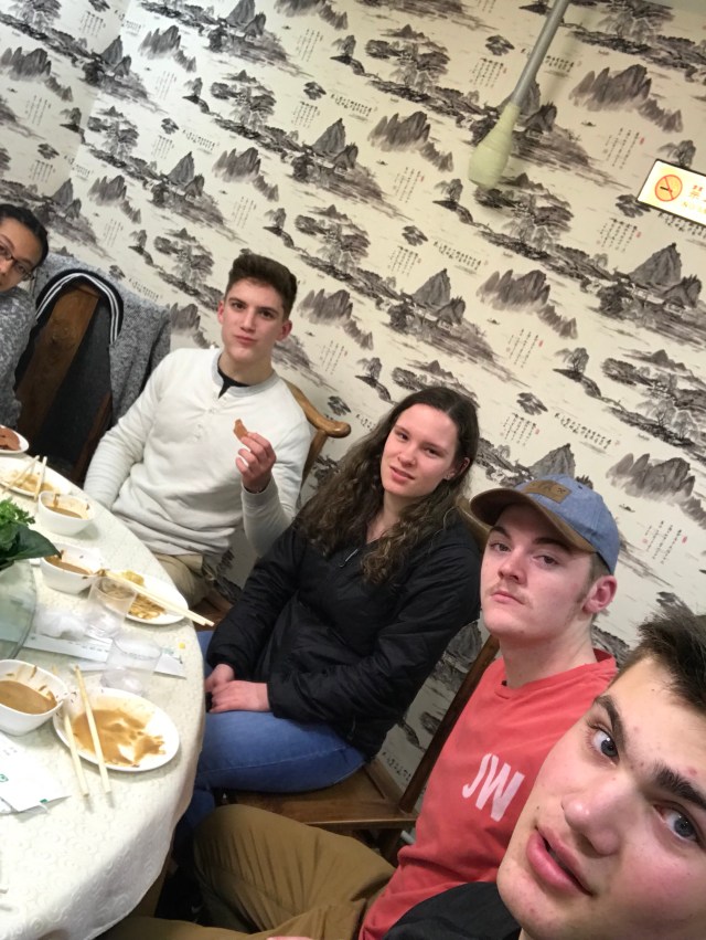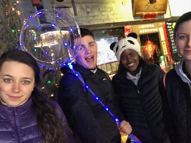 When we arrived at the Great Wall, it was humbling to say the least. The Wall is so expansive that it makes one person feel so small in comparison. The seniors decided to go up the most difficult stretch of the Wall and I was absolutely not prepared for the athletic endeavors that would follow. At points, I was climbing up what felt like cliffs on all fours just to make it to the top! In the end it was totally worth it, the views were priceless! After the Great Wall, we returned to Beijing for dinner. Then, after dinner, we took the subway to a local shopping street. I bought a selfie stick and a ballon with super fun lights on it. Alex and Joanna were not half as thrilled about the selfie stick as I was! After buying over eight different types of street foods, we took the subway back to the hotel. Unfortunately, despite my best efforts, my balloon was unable to ride on the subway with me because apparently a ballon can become a bomb! Who knew? On Day 4, it is off to Xi’an, the first capital of China!
