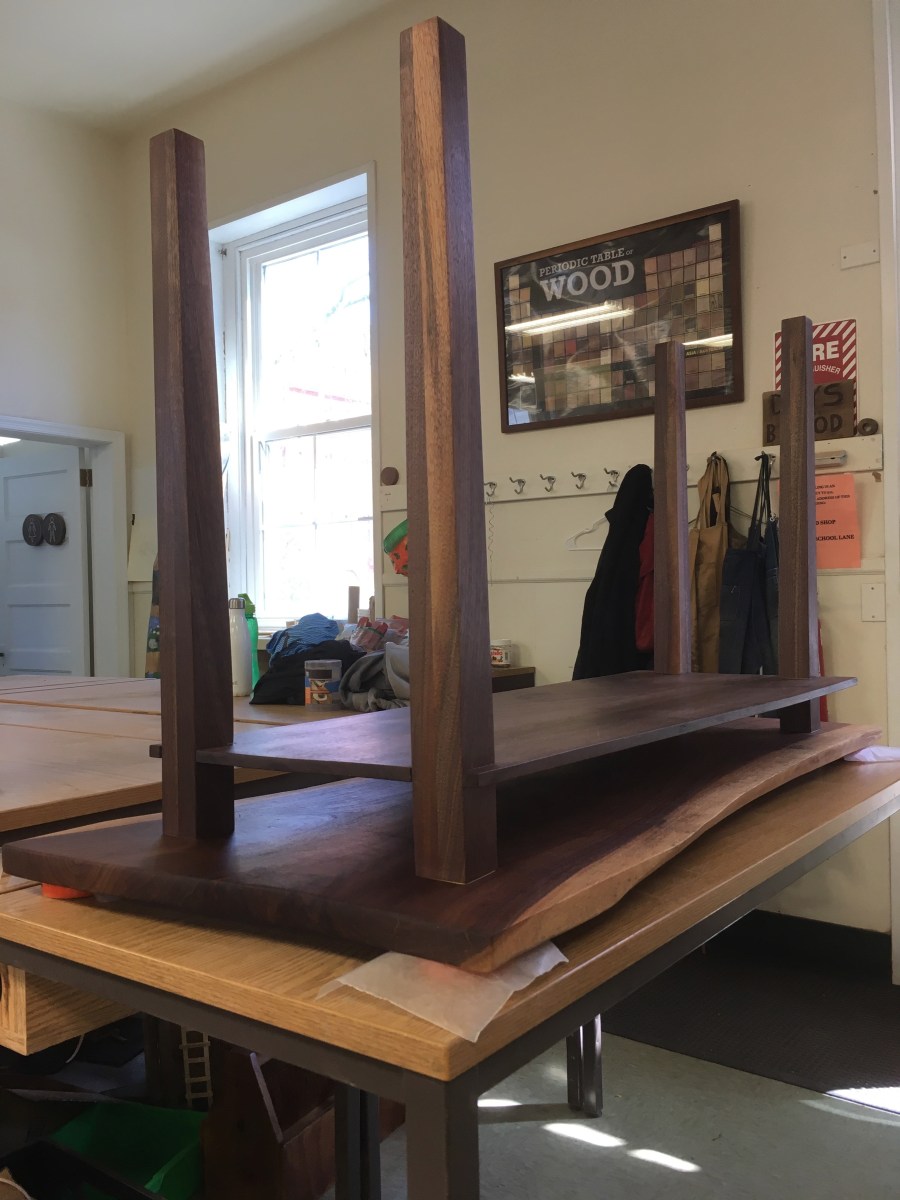 It seems like the table has taken shape on its own in the last few days, and I’m beyond pleased with how it looks now. It’s fun to imagine who will end up using it when they stay in the Tiny House — a table and shelf made from walnut sourced from the campus, continuing to serve an important function, if in a slightly unexpected way.