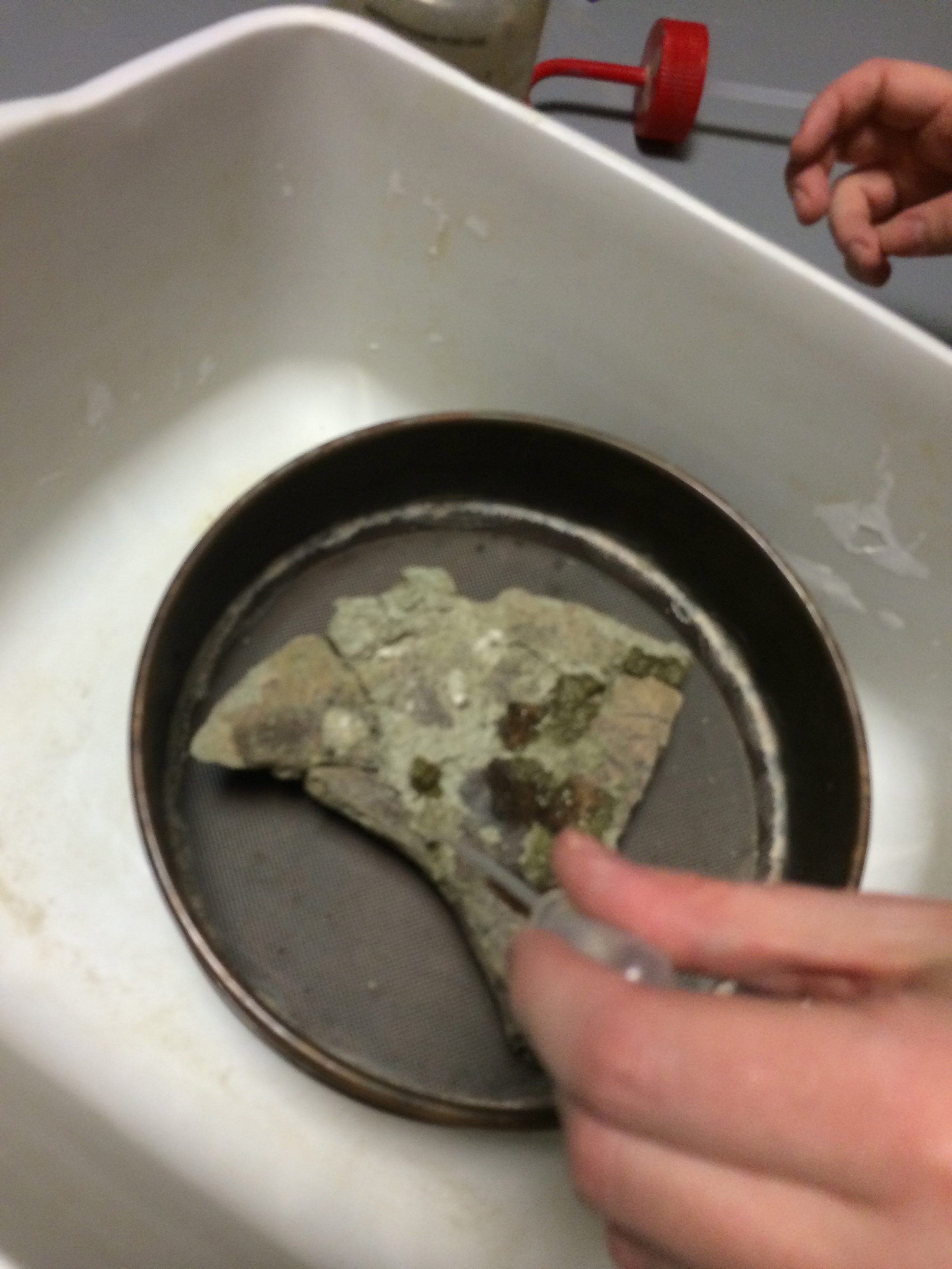 The last couple days have been a bit crazy. Now that my newbie training’s over, I’ve still been doing a lot of cataloging and numbering and making displays, but I’ve also been washing and repairing fossils which is super rad and much more hands-on. Basically, when fossils come in, they’re not the neat little (or huge) bones that you see behind glass. They’re almost always in these weird plaster bags that are full of dried mud and rocks (and maybe a tooth somewhere in there). You have to put this chunk of stuff in a sieve and run water over it. Most of the silt comes off pretty quickly, and as it goes from one big thing to a lot of little things, you have to decrease the water pressure so as not to damage anything. Eventually you wind up with a sieve full of rocks and fossil bits, which you have to separate, and then the fossils get another rinse before being set out to dry. It beats dinner wash any day.
