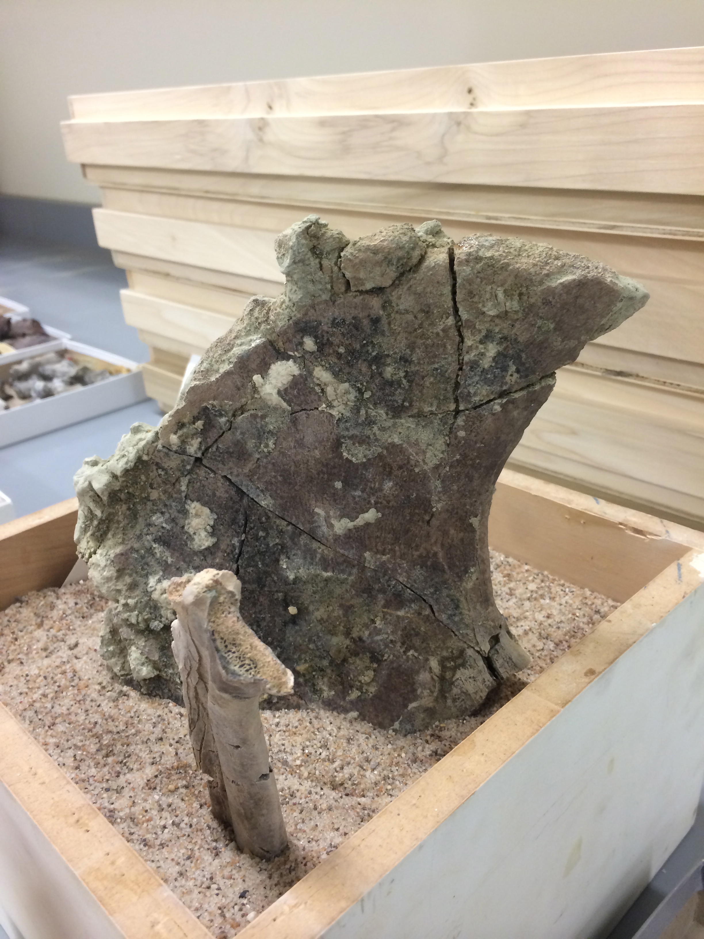 Over the end of last week we powered down and finished most of the smaller samples that we had to get through. During my last week, we’re finally going to break into the specimens that got the “dinosaurs and oversize” department its name. There are some things that I’m still not really experienced enough to do much with, like these brachiosaur vertebrae: