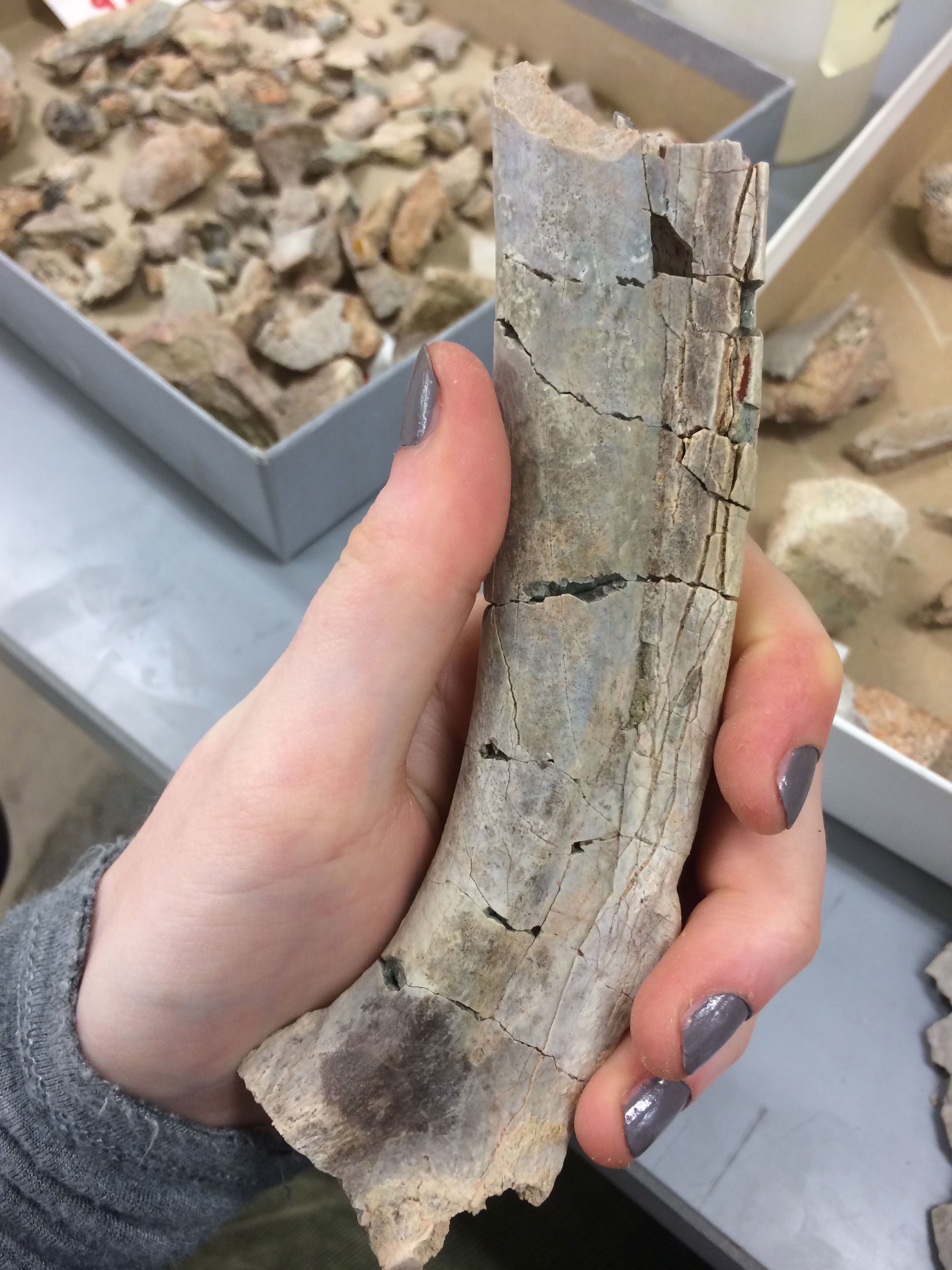 Repair, which was actually the part of my internship I was most excited about, is a total pain in the you-know-what. After all the bone bits are clean and dry, they get organized into boxes by site and then you have to repair them. This translates to: sit and stare at a box of bits of things and try to figure out how they fit together, if they were even from the same animal to begin with. It’s like the most frustrating jigsaw puzzle ever, except there are three different puzzles mixed together and half of the pieces are missing and there’s no picture on the front of the box. If the three of us working down there can get more than five or six matches in a day, it’s pretty successful. We got a whole rib (about two feet long) pretty successfully fixed up on Wednesday, and my manager bought everyone lunch.