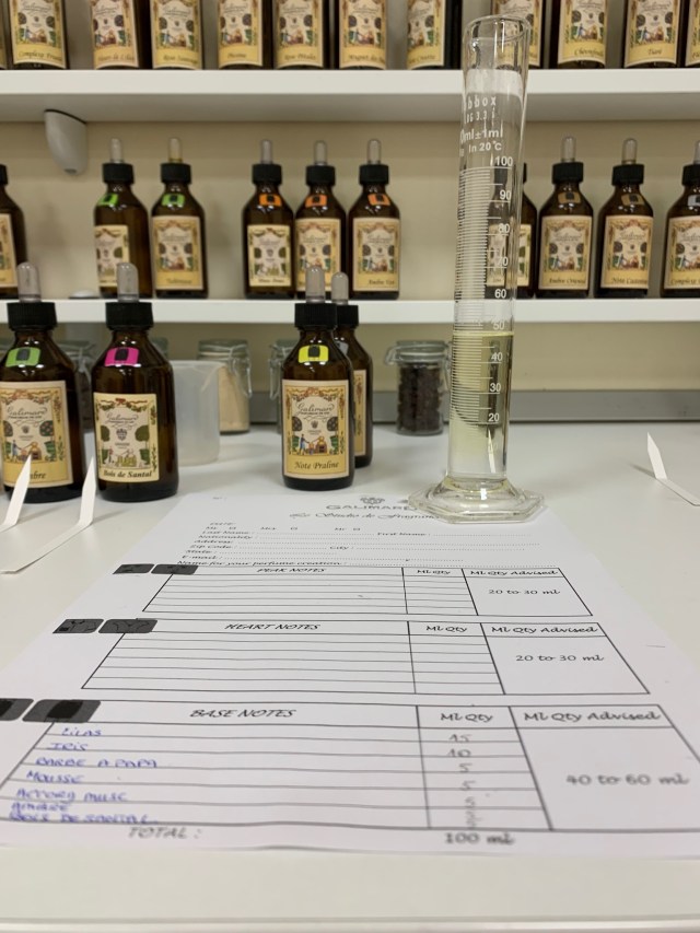 The first day was the basic introduction. I learned about what goes into fragrance production, both the business and the chemical side, and about scent recognition. For a long time, I tested maybe over 70 scents, and my instructor (who was the principal perfumer at Galimard) told me to connect each and every scent to a memory or event in my life to help me remember which smell was what. She taught me how the absolute (the “soul of the flower”) is extracted. How essential oils are obtained, and how and why people confuse them when they are very different products. And finally I learned how a parfum (also an Eau de toilette, an Eau de parfum and cologne, but I worked only with parfum) is made, and how if I were to start my own company, the extensive tests and forms I would have to fill out and pass. After six long hours, with a lunch break at my hotel, it was time for me to leave. I went and had dinner in town, and promptly fell asleep.