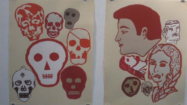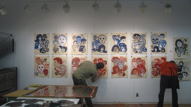 Thursday was spent with Donald at Pace Prints, the print studio associated with the Pace Gallery (which, according to Donald, is among the five most important galleries in the city), where we worked on a series of ‘crowd’ monoprints. The crowd is a subject matter relentlessly reworked by Donald; because of its versatility it’s become one of my favorites of his subject matters. For this project, Donald made a series of nearly 70 woodcut faces and skulls (‘Just two eyes, a mouth and a nose,’ as he says), which were arranged like puzzle pieces, inked, and printed on handmade paper. Most of the faces were layered with Chine Colle, a process that glues rice paper under the ink and onto a page during the printing process. This gave the opportunity for the negative space of each face to be a different color, despite the monochromatic inking.